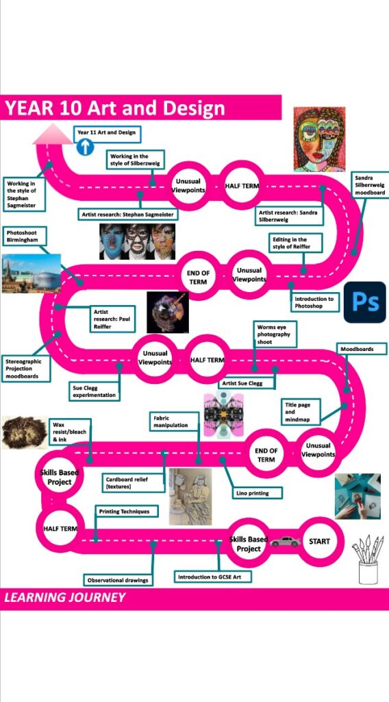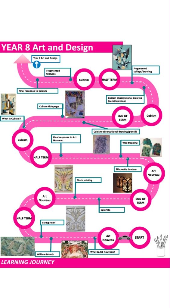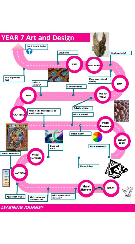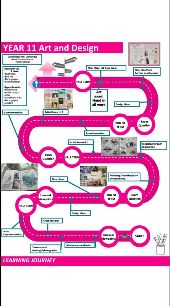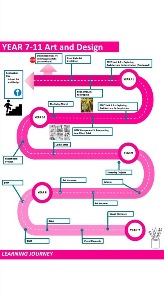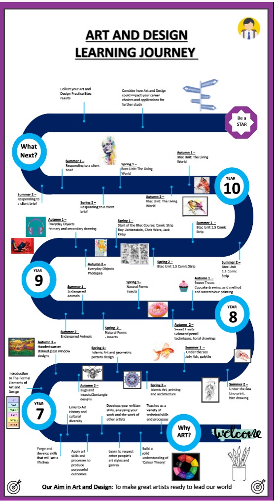 The Art Department is committed to creating an active learning environment, which fosters rich and meaningful work. The Art Department is a vibrant and energetic place, which develops a creative and disciplined approach to the study of Art through a combination of practical and written activities designed to ensure our students are problem solvers and independent learners, who exhibit resilience, self-control, organisation, presentation skills and collaborative skills at all times. In Art, students will explore all areas of the assessment criteria both visually, practically and through research inside and outside of the classroom. The written component of the curriculum focuses on History and Appreciation of Art. The History element focusing on developing students’ awareness and appreciation of the world around them. We aim to foster an appreciation and understanding of both current affairs and historical knowledge where necessary, while orchestrating each assessment objective in a timeline of developments.